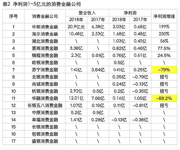 在净利润小于1亿元的第三梯队中,华融消费金融2018年经历了经营业绩88.2%的大幅下滑,还遭遇董事长、总经理被双双免职的窘境,最终跌出第二梯队阵营。
