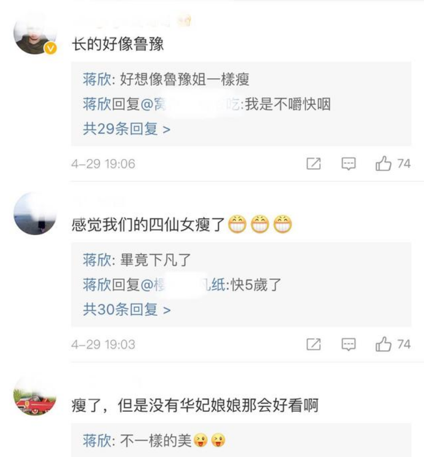 也正是因为被说胖,所以在之后蒋欣就决心减肥,她不断坚持运行,坚持多吃素食之类的绿色食品,减肥效果也很有效,后来蒋欣在出演其他作品的时候真个人看上去的确比以前更有气质更美了。看她减肥成功,网友们也是为她感到很开心。