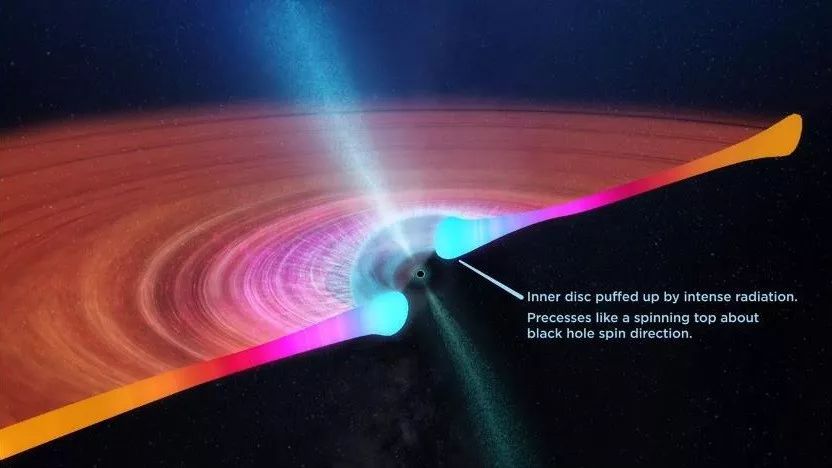 天文学家发现V404黑洞不断地摇摆,并且快速向四面八方射出等离子体。这种奇怪现象被称为“旋转顶部的摆动”。通常而言,黑洞超强引力会让周围材料快速旋转,然后材料被潮汐力均匀分布在黑洞吸积盘上,然而V404引力让吸积盘膨胀成直径约为1000万公里环形结构,但并不对称。
