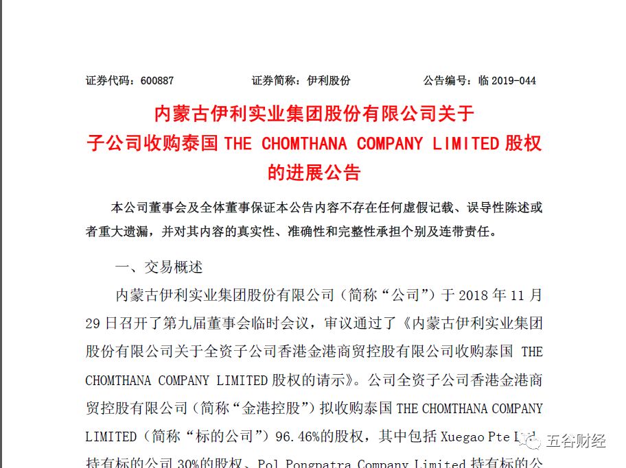 今年4月27日,伊利股份发布了《关于子公司收购泰国THE CHOMTHANA COMPANY LIMITED股权的进展公告》。