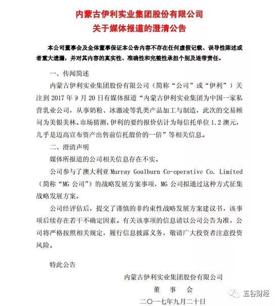 公告显示,伊利股份于2017年9月21日发布了《关于媒体报道的澄清公告》,其参与了澳大利亚 Murray Goulburn Co-operative Co. Limited(下称“MG公司”,业界俗称迈高)的战略发展方案事项。