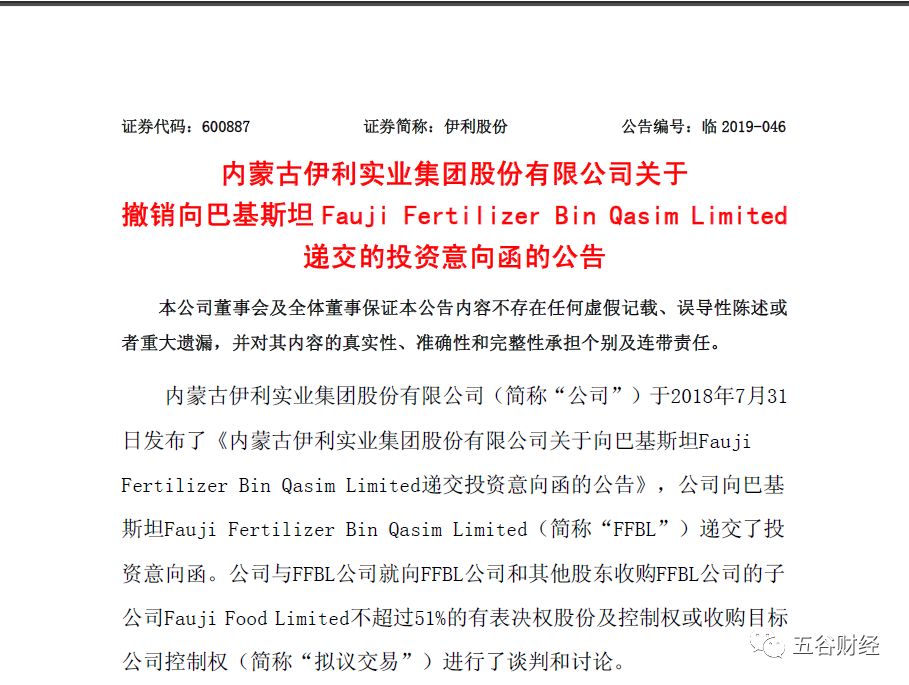 4月30日,伊利股份(600887.SH)发布了《关于撤销向巴基斯坦Fauji Fertilizer Bin Qasim Limited递交的投资意向函的公告》,引发投资者围观。