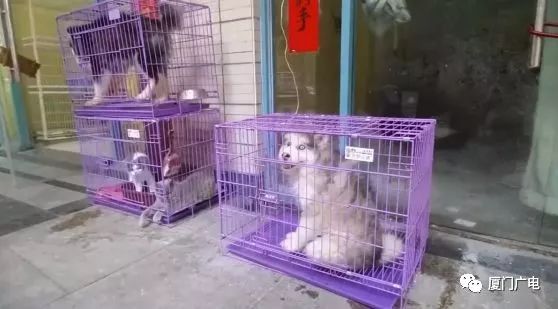 其中一家宠物店门口摆放着6个笼子,笼子里有近20只的小狗。