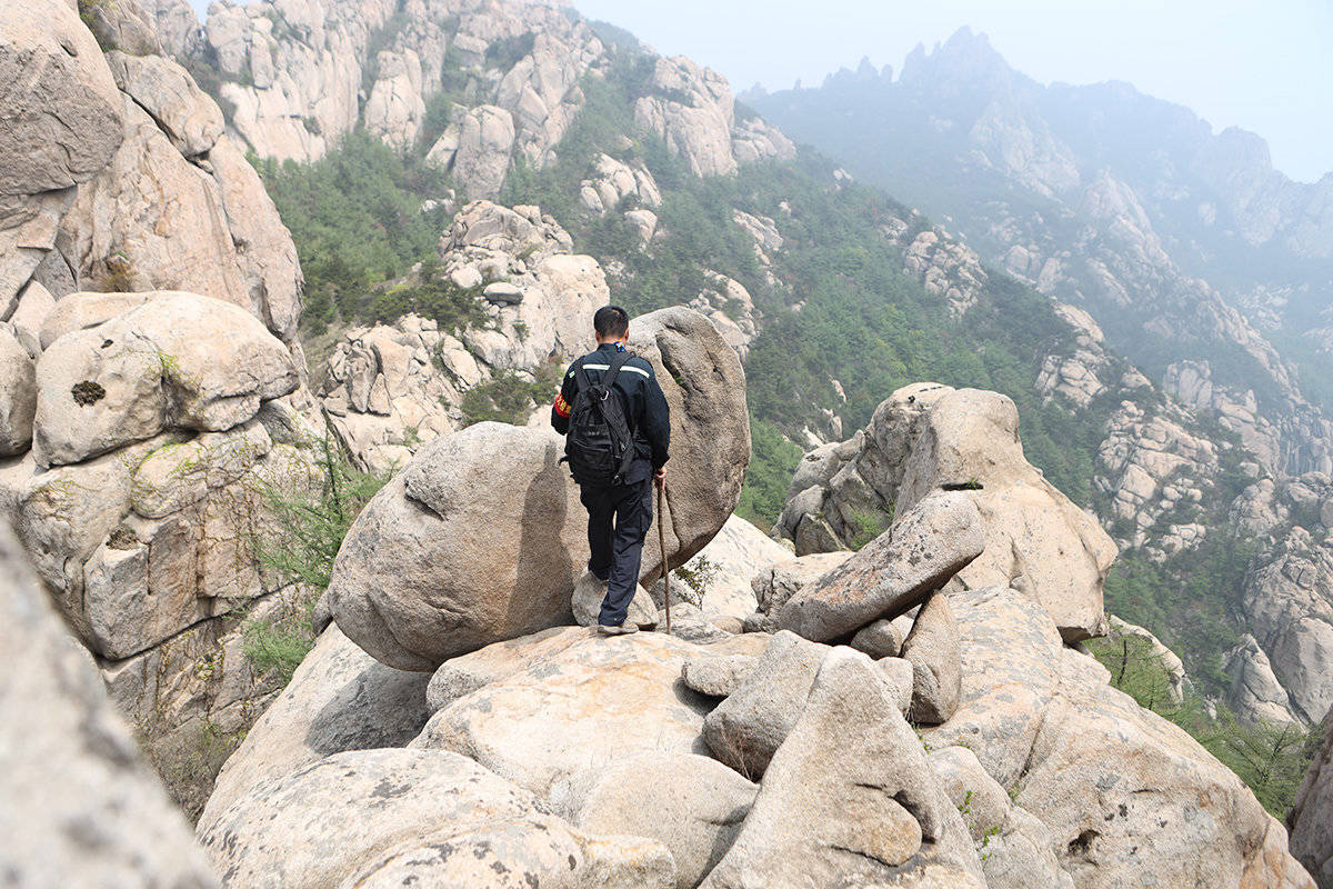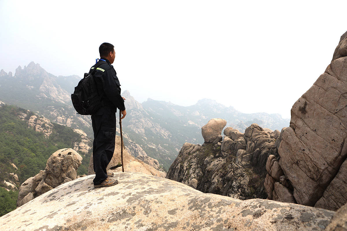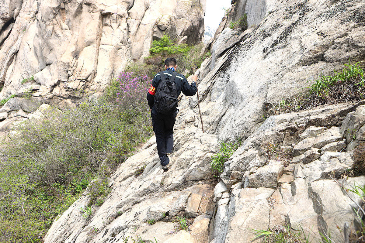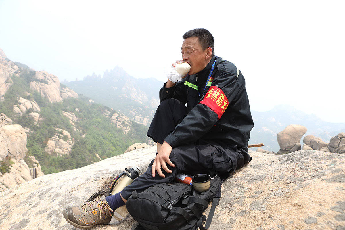 顺着山涧,走了一些险要的山路,兰师傅来到海拔810米的越龙峰,这里是一些“驴友”经常光顾的地方,所以必须来查看一下。时至中午,兰师傅一个馒头一根火腿就解决了午饭,他边吃饭边揉着他那酸痛的膝盖,下午还要继续巡山。五一期间,兰师傅和他的20多名同事都不能休息,要加班加点保证森林安全。