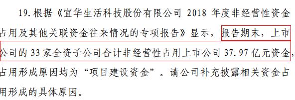 根据《宜华生活科技股份有限公司 2018 年度非经营性资金占用及其他关联资金往来情况的专项报告》显示,报告期末,上市公司的 33 家全资子公司合计非经营性占用上市公司 37.97 亿元资金,占用形成原因均为“项目建设资金”。