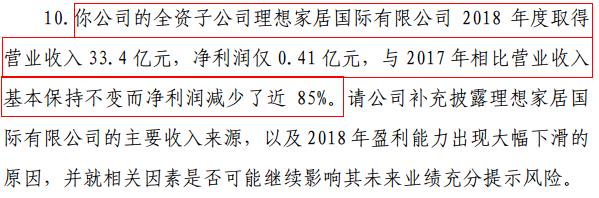 上交所要求补充披露理想家居国际有限公司的主要收入来源,以及 2018 年盈利能力出现大幅下滑的原因,并就相关因素是否可能继续影响其未来业绩充分提示风险。