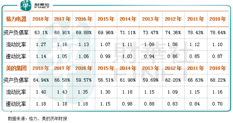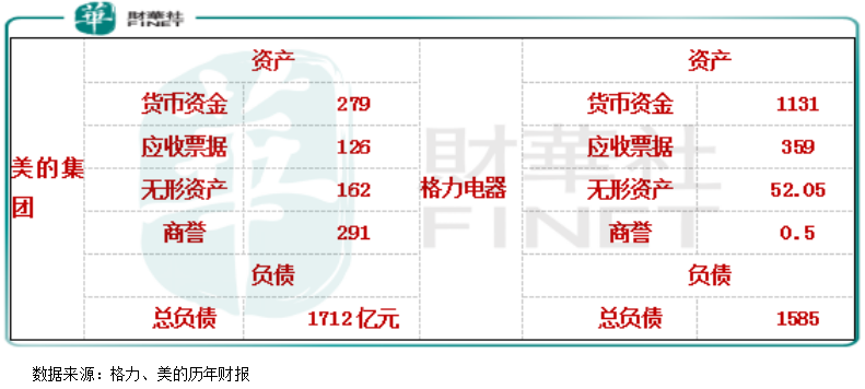 我们列举这两家公司最新一期的(2019年一季度)报表重点数据看:资产项,格力账上的货币资金项目加上等同于货币资金的应收票据为1490亿元,这两项资产占总资产的约59%,无形资产为52.05亿元、商誉为5180万元,这两项资产占总资产的2%;美的账上的货币资金项目加应收票据为405亿元,这两项资产占总资产的约15%,无形资产为162亿元、商誉为291亿元,这两项资产占总资产的约17%;负债项,格力总负债为1585亿元、美的总负债为1712亿元。