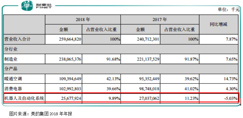 这点也可以从美的2018年年报中机器人及自动化系统的营业收入下滑可以看出。