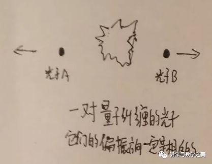 就是说,你测量了其中一个光子,这一个光子的状态坍缩成了比如说顺时针偏振。在遥远地方的另一个光子它的状态就同时坍缩成了确定的逆时针偏振,仿佛这两个光子间有一个可以超越光速的联系,可以让它们瞬间可以达成共识。